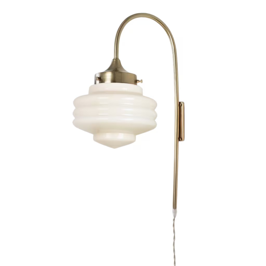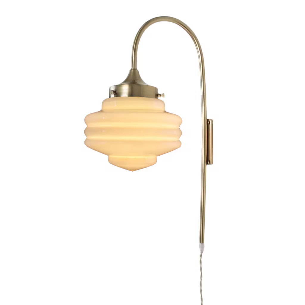 Lámpara colgante pequeña con un bonito borde ondulado y detalles en latón cepillado con un cordón textil trenzado marrón. Nos la imaginamos sobre la mesa de la cocina, al lado de un ventanal o sobre las mesitas de un dormitorio.