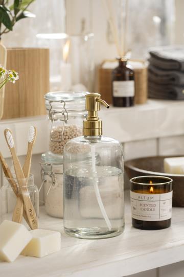 Bote de cristal con tapa de madera y cuchara. El bote además tiene un pequeño soporte para colgar la cuchara.