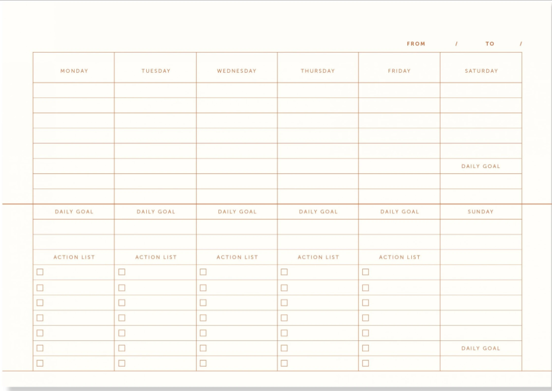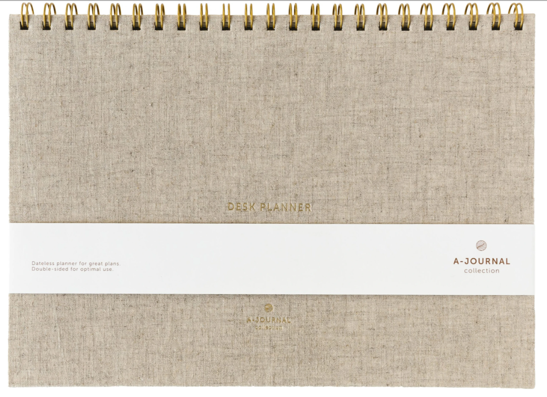 La agenda de escritorio de lino de A-Journal es perfecta para tu elegante interior. La elegante cubierta está hecha de lino beige y está impresa con lámina dorada. Una bonita agenda que es realmente útil, con bonitas vistas generales. El interior tiene un diseño claro con prácticas listas. De esta manera, empiezas cada semana con una pizarra limpia y tienes toda tu planificación semanal en papel de un vistazo. La agenda tiene encuadernación en espiral y no tiene fechas, ideal si a veces te saltas algunas semanas.